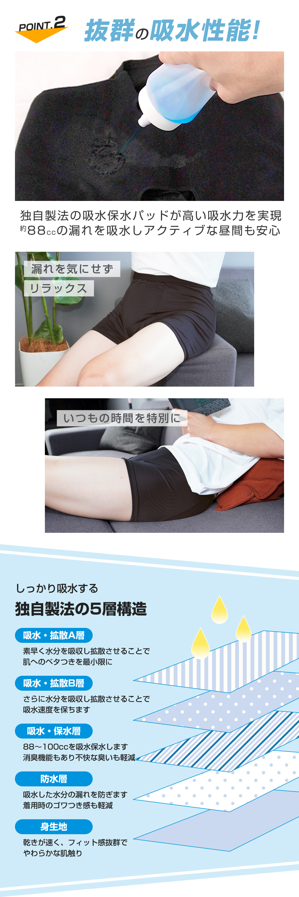 独自製法の吸水保水パッドが高い吸水力を実現。約88ccの漏れを吸水しアクティブな昼間も安心